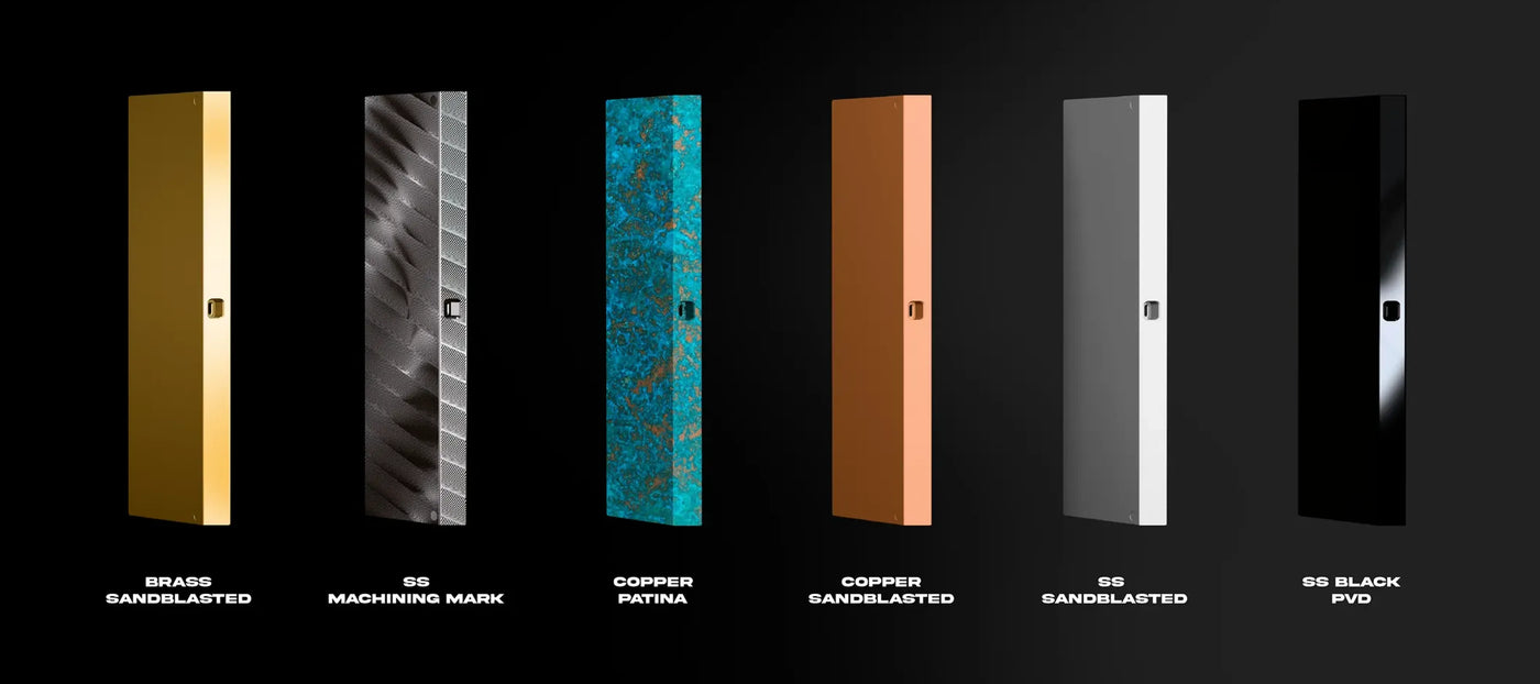 Weight options: stainless steel in sandblasted, machine mark, or black PVD; brass in sandblasted; and copper in sandblasted or patina, with patina available in limited quantities.