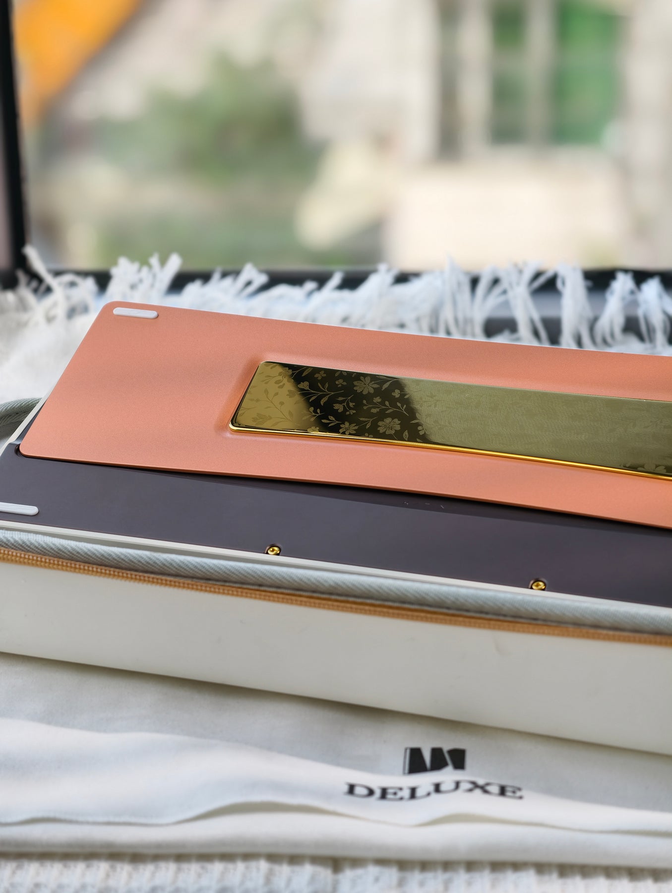 Floral ($535): Milky White coated top, Basalt Brown bottom, and Blasted Copper internal weights with "Floral Flower" laser engraving.