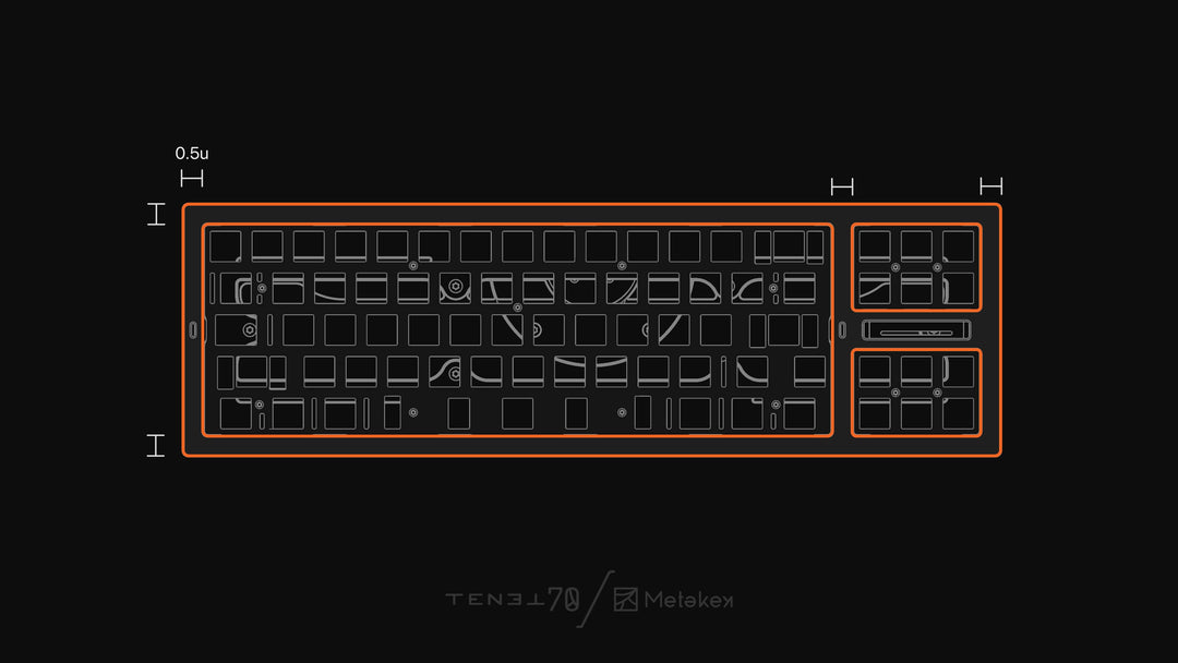 It also serves another unique purpose: to allow transformable layout configurations. The ability to switch between a Regular (directional key section to the right of the main keys) to a Southpaw (arrow keys to the left) layout. The trouble with 80% layouts with the isolated arrow and macro key section, while clean and more straightforward to use, inadvertently steals from the mouse's effective area of movement. In order to give the mouse more space, the southpaw layout was designed with this in mind. Rather than being torn between the tradeoffs between each layout, the TENET70 allows you to use both. To switch between the two layout configurations after assembly, all the user has to do is to undo the screws holding the upper and lower cases together, disconnect the cables between the PCBs, and switch the different area PCBs around, disconnect the bottom weight from the lower case, then rotate the upper and lower case by 180° and reassembling the keyboard as such. Although slightly tedious, the whole switching process doesn't damage the keyboard and can theoretically be switched as many times as desired without affecting lifespan.