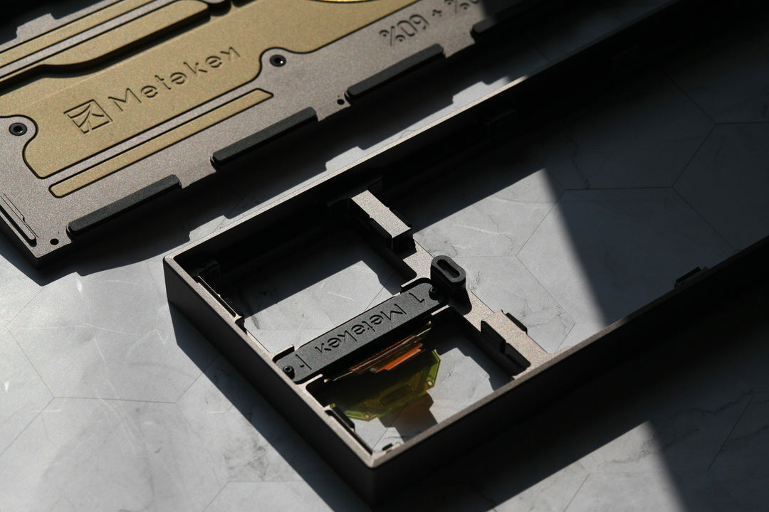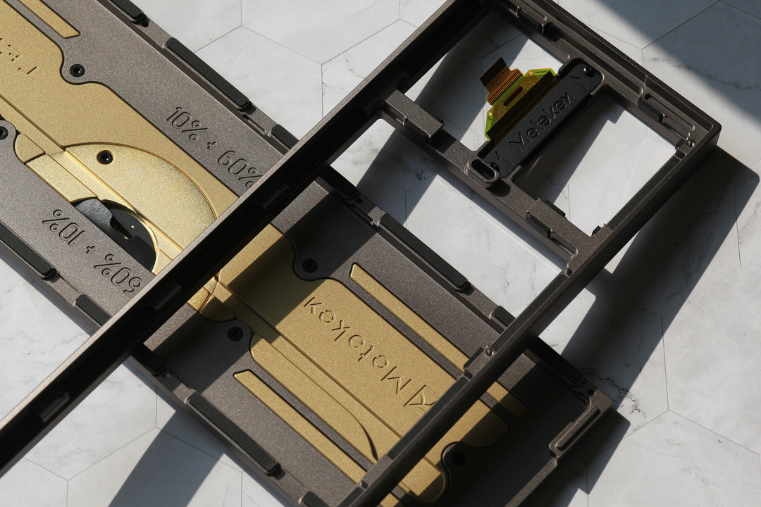 Optimizes the typing feel and sound as well as enhancing the overall atmosphere of the board. The brass surface on the main bottom weight is sandblasted and coated to maximize the brass's sandblasted texture as well as prevent oxidation. The other bottom weight with the USB port outlet is sandblasted and plated with 24K gold, two processes that together create a unique and beautiful texture.