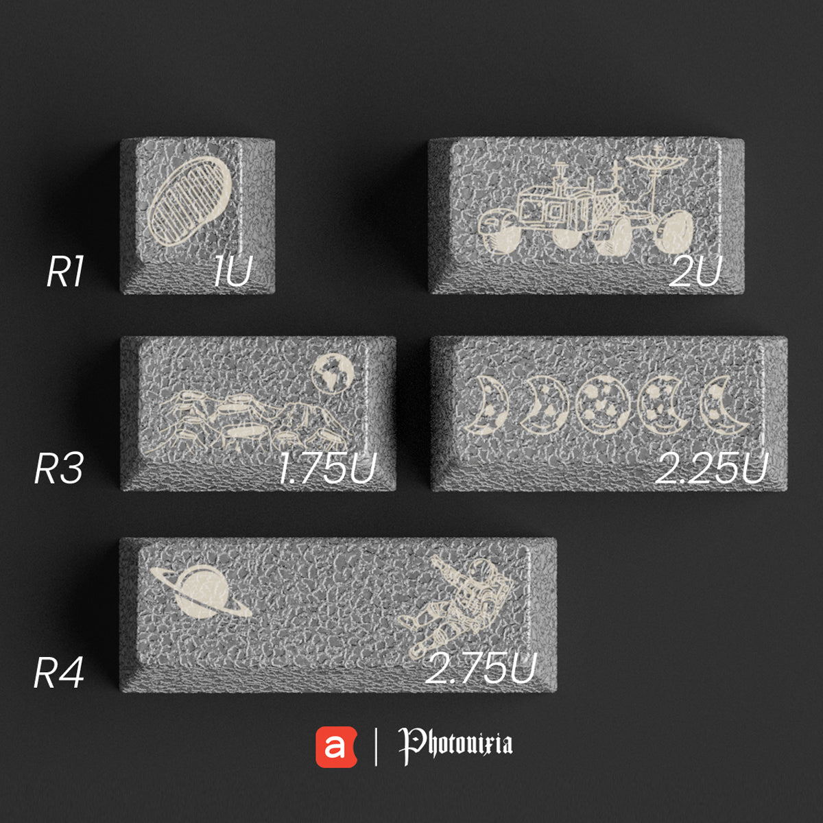 The moon-themed keycaps set features 5 novelty add-on keys showcasing five iconic designs representing humanity's exploration of the moon: a lunar footprint, a lunar rover, a moon crater, a spacewalk, and lunar phases. It serves as a daily reminder of the incredible stories and milestones of our journey to the moon, transforming it into more than just a functional accessory but also a tribute to the spirit of discovery.
